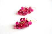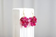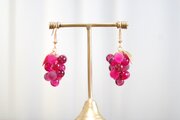 レジンで二種類の赤色の球体を作り、葡萄の房のように連ね、葉っぱチャームを添えたピアス。