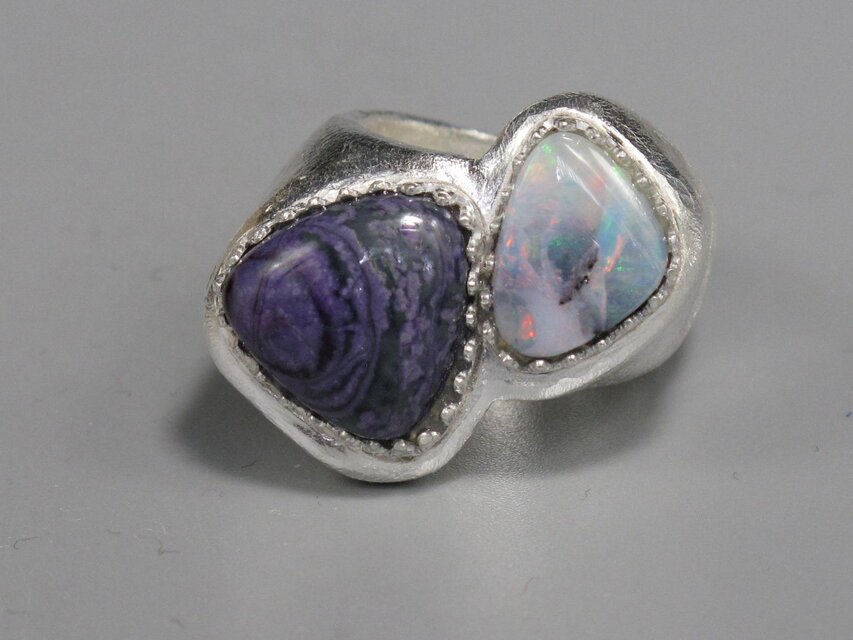 全体的に紫色がかっている石は、スギライト、そしてオーストラリア産ボルダーオパールです。