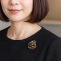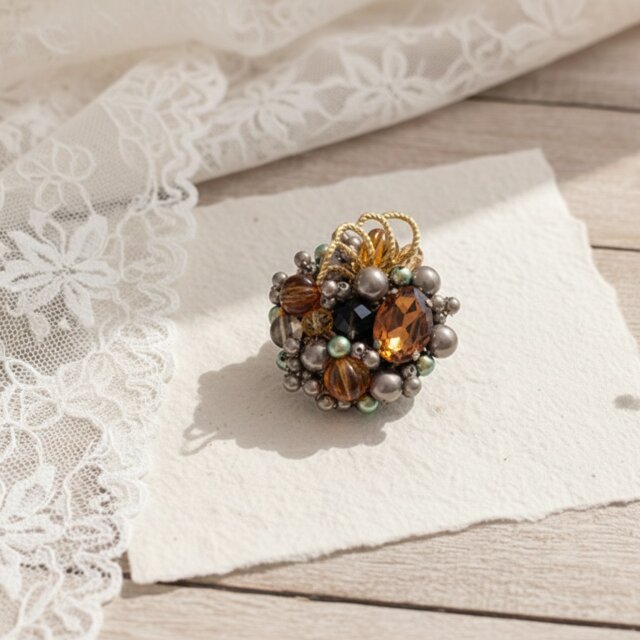 落ち着いたブラウンやアンバー系のトーンを中心に構成し、クラシカルな雰囲気に仕上げています。ニットやコート、ワンピースなど、秋冬のファッションにさりげなく華を添えてくれるアイテムです。