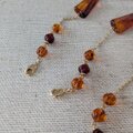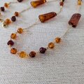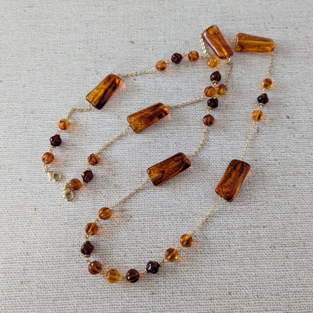 アンバー色のアクリルビーズと、赤・金のチェコガラスが繊細なチェーンに浮かぶ、ステーションタイプのロングネックレスです。