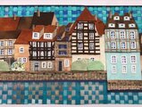 ヨーロッパの歴史的や趣のある街並みをモチーフに色々な色や柄の布を使って半立体の作品を制作しています。空や海などの背景は画像紙に布を貼り、5〜3mmのリボン状にカットしたもを編み込み、空や海を表現しています。