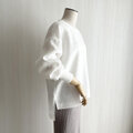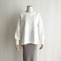 スウェットのように、袖口と衿ぐりには1×1の柔らかいリブがついていますので袖をまくって着用可能です。袖口はギャザーが寄っていてふんわりしています。袖口リブは長めですので、画像のようにお好みでリブを半分に折って着用するのも可愛いです。衿ぐりもリブがストレッチなので首回りに馴染みます。