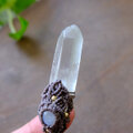 力強くすっと太く長く伸びた水晶は、重量感と存在感があり繊細なクラックも魅力的です。上部には、月のように青く光り輝くブルーシラーが美しいムーンストーンをあわせ、印象的で個性溢れるペンダントに仕上げました。