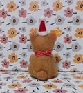 クリスマスのサンタ帽をかぶった羊毛フェルトのクマ、ケーキを持つ可愛らしいデザイン。