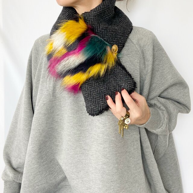 カラフルなカラーミックスのエコファーが可愛いアクセサリー感覚の大人カジュアルなコンパクトマフラーです
