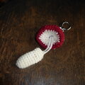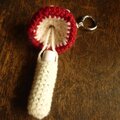 毛糸で編んだキノコのミニポーチです。