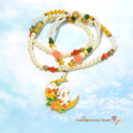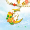 ペンダントトップには、花に彩られた三日月の上に佇む白いうさぎのチャームが、胸元にやさしい存在感。