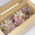 お花はピンクの紫陽花と白のカンパニュラそして周りを彩るちいさなお花はピンクのかすみ草です。ナチュラルな木目色のフォトフレームで優しい温かみのあるお部屋になります。