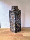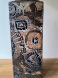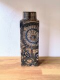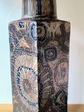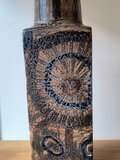 このフラワーベースに描かれたモチーフは、古代の壁画や象形文字を思わせる、力強い抽象的なパターン。素朴な土の質感と、深く釉薬が絡み合った、立体的なレリーフが特徴です。