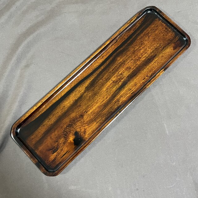 リピーターです。太い筆でザッと線を描いたような、モダンな黒柿のお盆。購入者の好みに合わせてさらに漆を重ねてつやつや・なめらかに仕上げて下さいました。 とても素敵で、お茶の時間がより豊かに感じられます。大切に使っていきます。有難うございました!