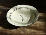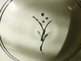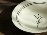 素地に化粧泥を掛けて野花を描き、透明釉を施釉してから部分的に織部釉を彩色し焼成しています。