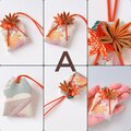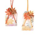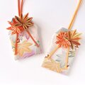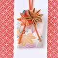 お守り袋には江戸時代から伝わる日本の伝統工芸であるつまみ細工で作った紅葉をあしらいました