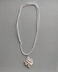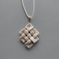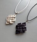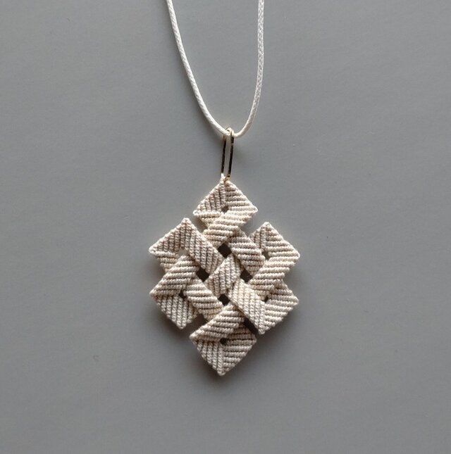 コットンの糸を結んでテープ状にし、それを組むようにエンドレスモチーフに仕上げています。