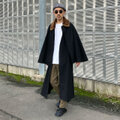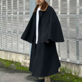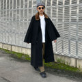 袖のないケープデザインとフロントのベスト状の構造により、袖を通してポケットに手を入れることができる実用性も兼ね備えています。