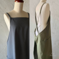 背中で紐をクロスし、それぞれ通し口に紐を通して結び止めをつくると被るだけのスタイルがお楽しみいただけます。