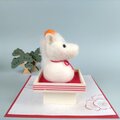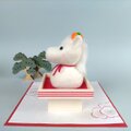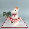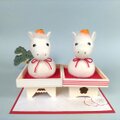 白馬のふわふわとした「たてがみ」は、温かさを感じさせ、木製の三方にちょこんと乗る姿が愛らしさを引き立てています。