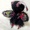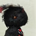 首、両羽、両足にジョイント入り。四つの手はプラスチックボタンの糸ジョイント。目は海外作家様のオリジナルグラスアイを使用しています。色は赤✕黒✕黄。