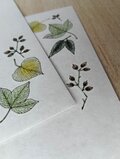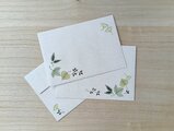 封筒はホワイトクラフト紙で表と裏の違いの味わいがあります。柄の部分には薄い和紙(マスキングテープ用紙)で作ったシールを貼っています。封筒のデザインは3種類です。1枚ずつ貼っているので写真は一例になります。バリエーションをお楽しみ下さい。