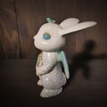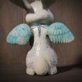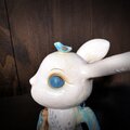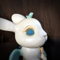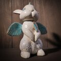 空色の翼を広げ、小さな小鳥を頭に載せた白色のうさぎの置物です。羽のペンダントが自由な魂の持ち主のうさぎによく似合います。