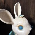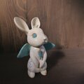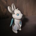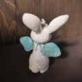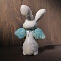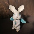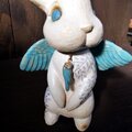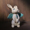 空色の翼を広げ、小さな小鳥を頭に載せた白色のうさぎの置物です。羽のペンダントが自由な魂の持ち主のうさぎによく似合います。