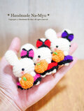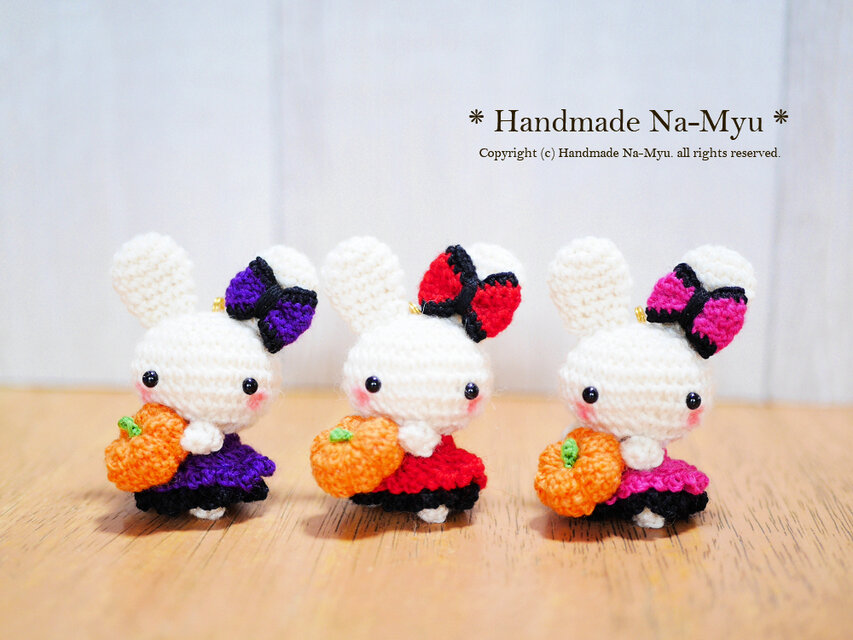 【受注制作】あみぐるみ:Halloweenふわふわワンピのうさぎちゃん・カボチャ抱っこ(約5cm)/ボールチェーン