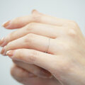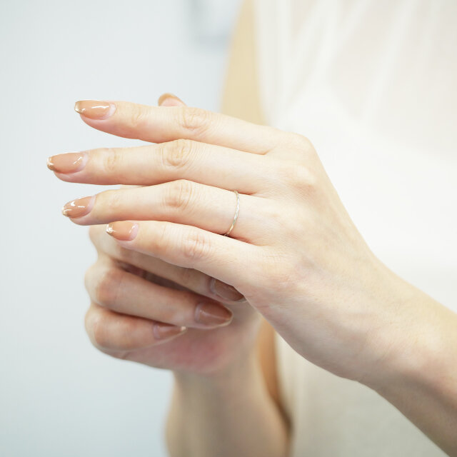 繊細なラインが美しく輝く、シルバー925製の極細リング。約1mm幅の華奢なフォルムに、手仕事で施された凹凸のテクスチャーがさりげない光をまといます。単体ではミニマルに、重ね付けすれば指先に奥行きを生み出すデザイン。