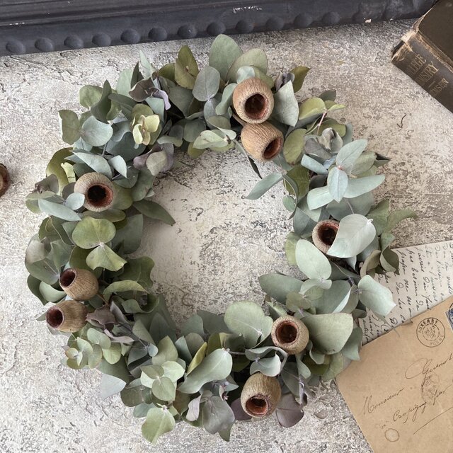 ボリューミーに仕上げたユーカリのシンプルリースに実ものガンベルズを合わせナチュラルに仕上げリースです。大きさもあり存在感あるリースになっております。