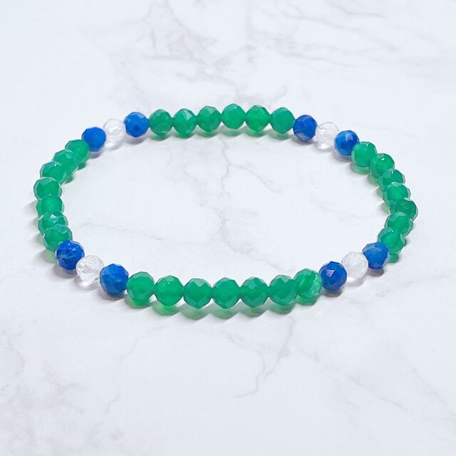 パキッとした鮮やかなグリーンの「グリーンオニキス」をメインに、瑠璃色の「ラピスラズリ」、そして透明感溢れる「水晶」を組み合わせました。