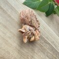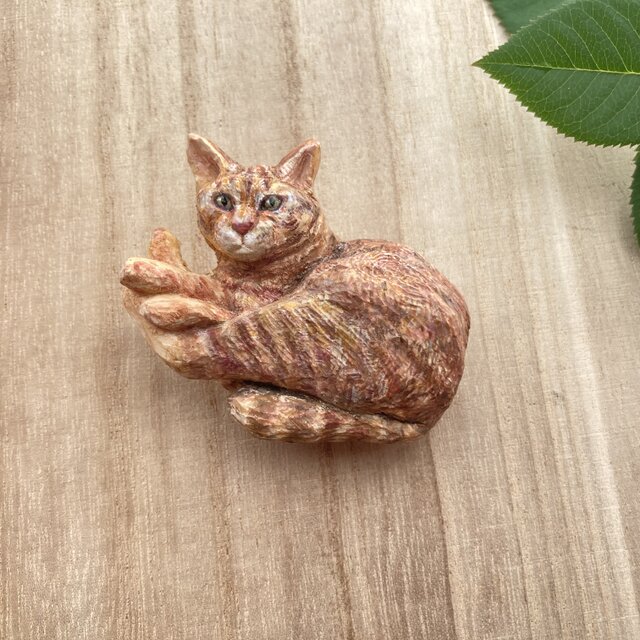 リピートです。今度の作品も大変可愛く、ぬくもりを感じます。木彫りですので軽やかなのも良いですし、毛並みがまるで本物の猫のように見えます! 付けない時は前回購入したブローチとセットで飾ります。 今回もありがとうございました!