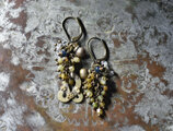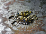 oldアフガンメタルパーツとたわわなトルマリン&ハーキマーダイヤモンド、インディゴブルービーズ、民族鈴のアンシメトリーピアス