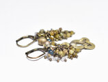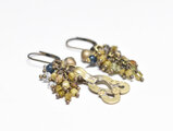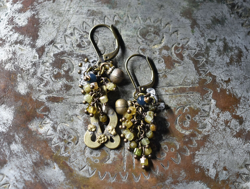 oldアフガンメタルパーツとたわわなトルマリン&ハーキマーダイヤモンド、インディゴブルービーズ、民族鈴を繋いだアンシメトリーピアスです。
