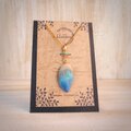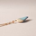 チェーンは等間隔に現れる小さな玉が可愛い1.5mmボールステーションタイプのゴールド色を組み合わせました。ヘッドとの間にはブラウンのクリスタルビーズをひとつ挟みました。縦ラインで胸元をシャープに印象付けます。