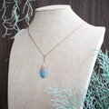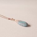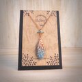 チェーンはすっきりとしたアズキタイプのコパー色を組み合わせました。ヘッドとの間にはブラウンのクリスタルビーズをひとつ挟みました。縦ラインで胸元をシャープに印象付けます。