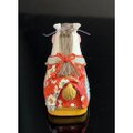 粘土でつくられた立体パーツに貴重な正絹縮緬を丁寧に貼り付けていき製作します。縮緬布の持つ独特の折ジワが織りなす表情が作品に素敵な表情と高級感を纏わせます。首元には小さなビーズをあしらいました。