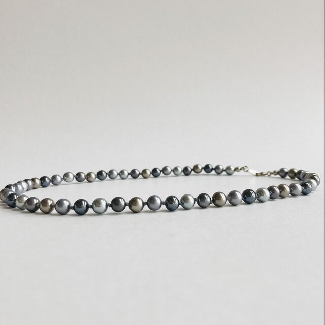こちらはガラス素材の原玉に、オリジナルカラーのパール塗料にて何層にも渡り重ね塗りを施した日本製ガラスパールネックレスになります。パール間1つ1つ丁寧に結び目を加えたオールノット加工にて仕上げています。パールカラーはきめ細かい質感と優しい艶感が特徴のグレー系カラーパール各種を使用。濃淡のある異なる複数のオリジナルカラーをランダムに通しました。パールサイズは直径約6mm、長さは標準的なプリンセスサイズの全長約42cm。留め具にはシンプルな引き輪・ダルマカンを使用。
