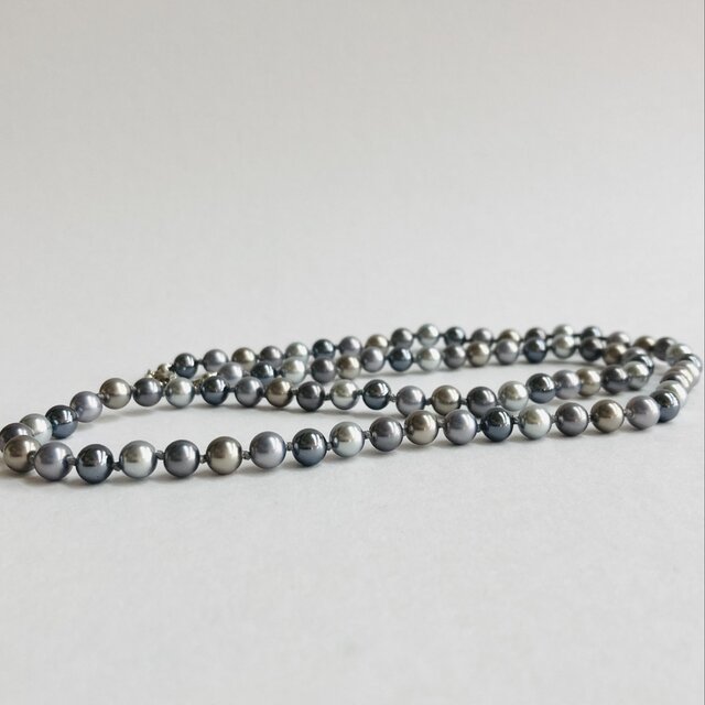 こちらはガラス素材の原玉に、オリジナルカラーのパール塗料にて何層にも渡り重ね塗りを施した日本製ガラスパールネックレスになります。パール間1つ1つ丁寧に結び目を加えたオールノット加工にて仕上げています。パールカラーはきめ細かい質感と優しい艶感が特徴のグレー系カラーパール各種を使用。濃淡のある異なる複数のオリジナルカラーをランダムに通しました。パールサイズは直径約6mm、長さは服の上から手軽にお使い頂ける全長約60cm。留め具にはシンプルな引き輪・ダルマカンを使用。