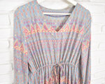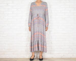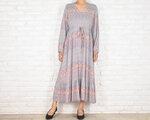【大きいサイズ】ヴィンテージエスニック柄長袖Vネックワンピース グレー