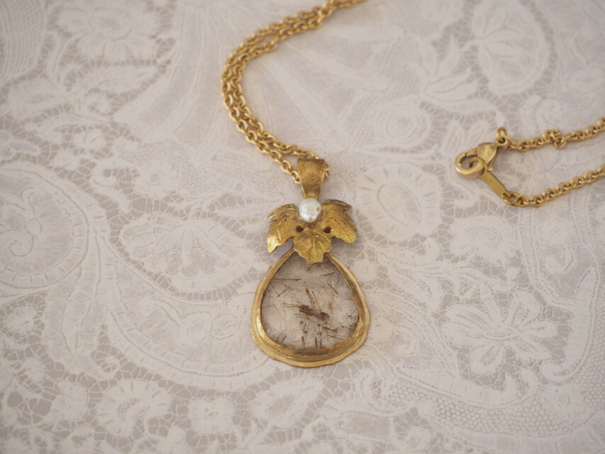 シャープなカット入りのルチルクォーツをネックレスに仕立てました。きらめく秋の一瞬を閉じ込めたような作品です。