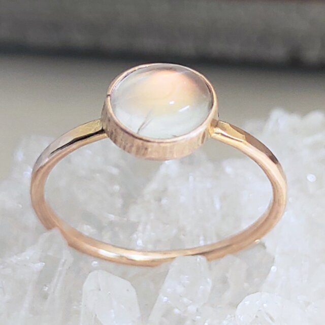ハッキリとしたオレンジ色のシラーがとても可愛いゴールデンムーンストーン(レインボーアンデシンラブラドライト)のアンティーク調14kgfリング*特有のクラックがありますがクォーツのような優れた透明度でシラーの色味が濃く映えます。様々な光源で様々な色合いのシラーをお楽しみ下さい*その殆どが小粒のルースで1ctを超えるものは大きいといえるほど、ゴールデンの俗称もあるようにフェルスパー属では最上位の希少性を誇ります*ムーンストーンらしい穏やかさの中にも確かな強さを感じられるようなシラーです*5~12号(推奨サイズ)の範囲を目安に調整可能、サイズ確定後に覆輪留めを致します*14kgfは真鍮を芯に14金の被覆が施され比較的アレルギーリスクが低く気軽にゴールドの輝きを楽しめるとして人気の素材となっております*