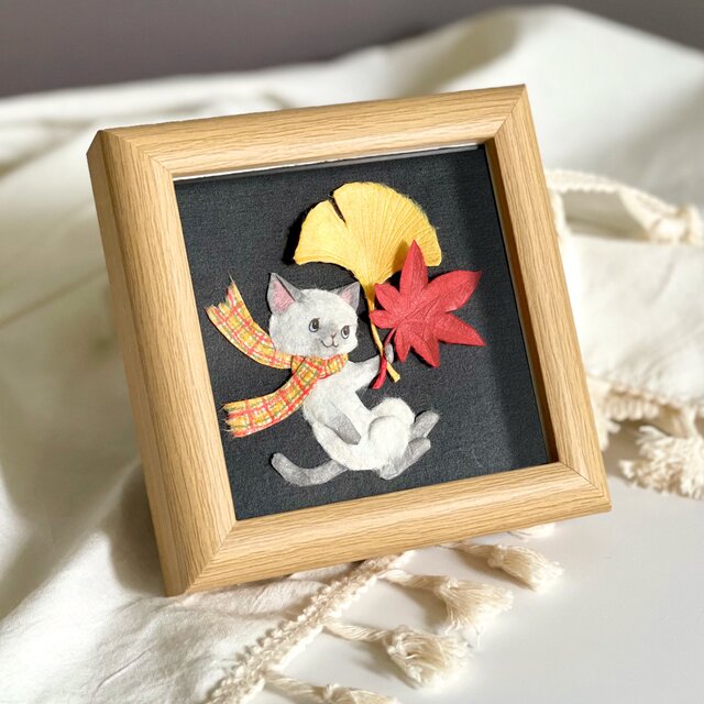 イチョウと紅葉の葉っぱを手にしたシャム猫のほっこり和紙アートパネルです。