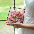 この作品は約14 x 14 x 10.5 cmの大きさで、高級感のある透明なギフトボックスに包装されているので、どなたにも安心してお贈りいただけます。また、箱は花をほこりや湿気から守り、より長く保存することができます。