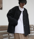 ノーカラーデザインにより、タートルネックやシャツなどを重ね着してもすっきりとしたシルエットに。