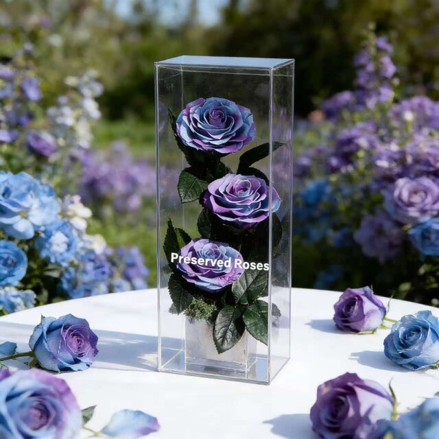作品のサイズは約12 x 12 x 28cmで、高級感のある透明なギフトボックスに梱包されているので、どなたにも安心してお贈りいただけます。また、ボックスは花を埃や湿気から守り、より長く美しい状態を保つことができます。