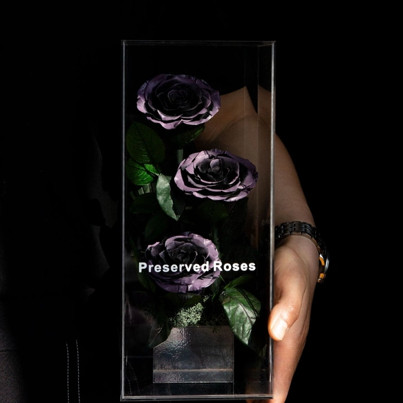 作品のサイズは約12 x 12 x 28cmで、高級感のある透明なギフトボックスに梱包されているので、どなたにも安心してお贈りいただけます。また、ボックスは花を埃や湿気から守り、より長く保存することができます。