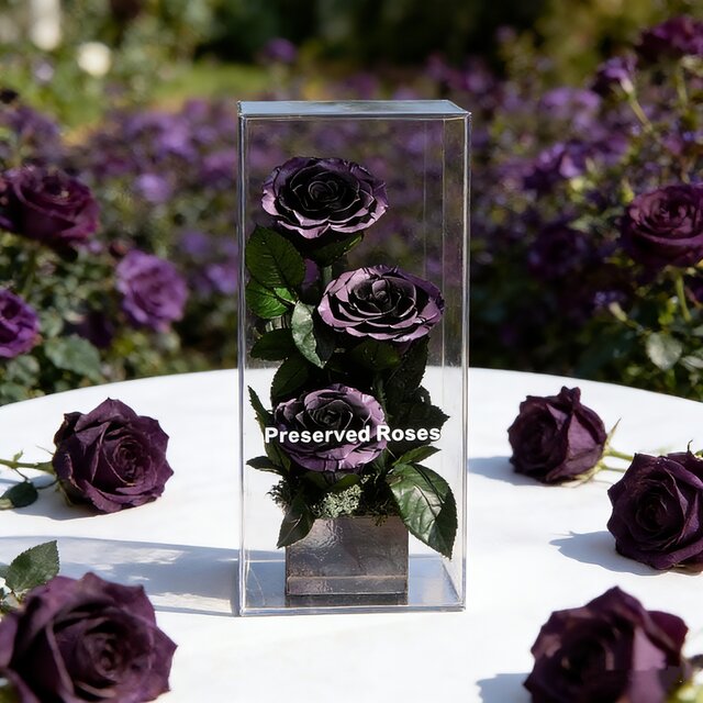 作品のサイズは約12 x 12 x 28cmで、高級感のある透明なギフトボックスに梱包されているので、どなたにも安心してお贈りいただけます。また、ボックスは花を埃や湿気から守り、より長く美しい状態を保つことができます。