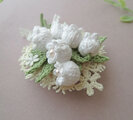 お花は純白の手縫い糸を二本どりにしてふっくらと可愛らしく、ひとつひとつ加減しながら編んでいます。お花の中には少しだけ綿を詰めて、優しく輝くホワイトピンクのパールビーズを縫い留めております。