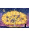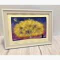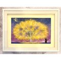 ふわふわ黄色の木と黒猫は、パープル濃紺のグラデーションの背景に手漉き和紙で表現した一点もののちぎり絵です。