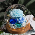 約12.5 x 12.5 x 14cmのこの作品には、光の効果を持つ豪華なガラスカバーが付属しています。光を灯すと作品に温かみが加わり、贈り物に最適です。ガラスカバーは埃や湿気から効果的に保護し、花の保存期間を延ばします。