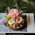 約12.5 x 12.5 x 14cmのこの作品には、光の効果を持つ豪華なガラスカバーが付属しています。光を灯すと作品に温かみが加わり、贈り物に最適です。ガラスカバーは埃や湿気から効果的に保護し、花の保存期間を延ばします。