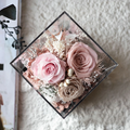 この作品は約10 x 10 x 10cmの大きさで、高級感のある透明なギフトボックスに包装されているので、どなたにも安心してお贈りいただけます。また、箱は花をほこりや湿気から守り、より長く保存することができます。